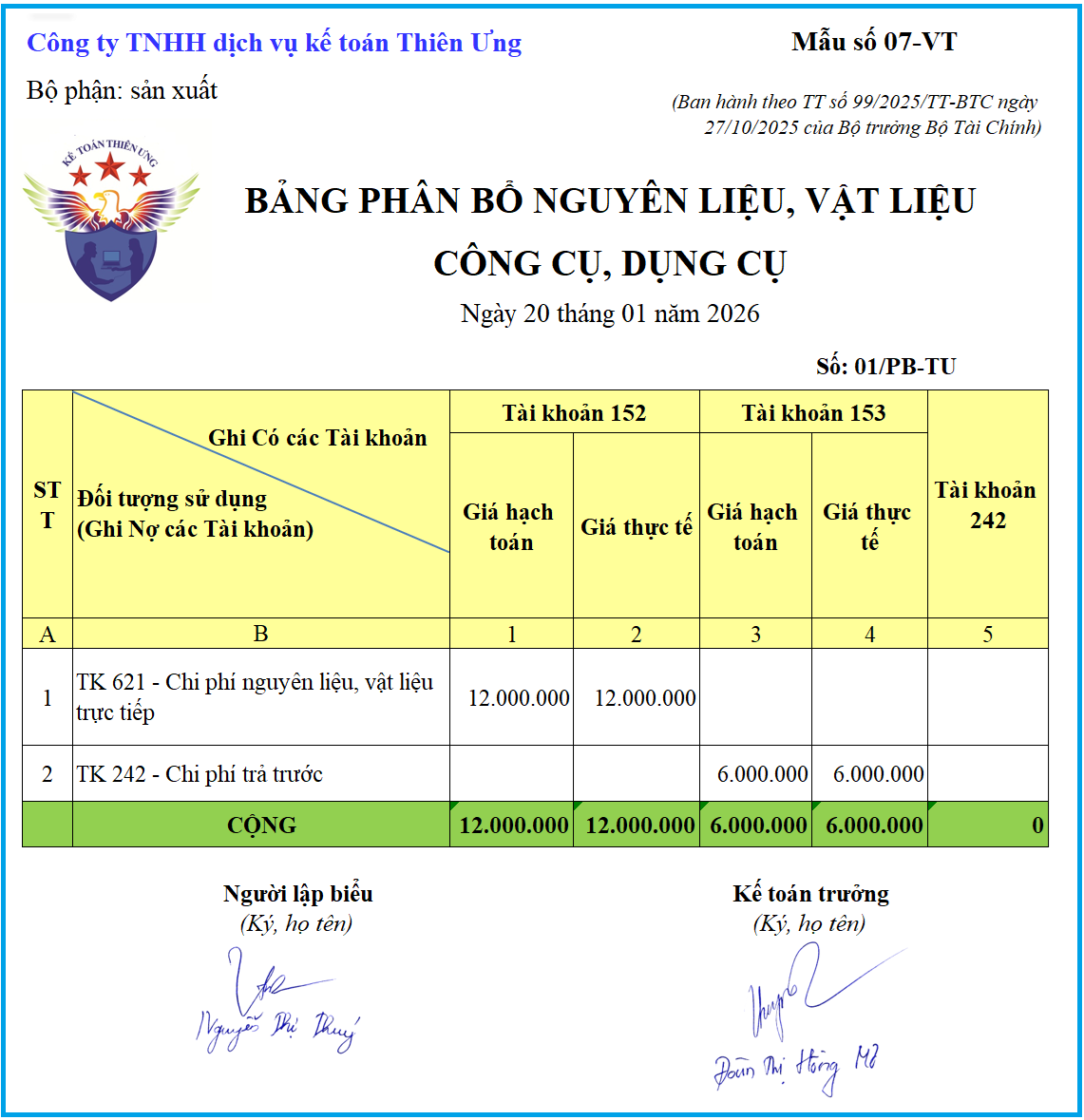 Dòng cộng ghi tổng số tiền đã mua các loại vật tư, công cụ, hàng hóa ghi trong Bảng.
