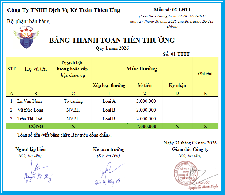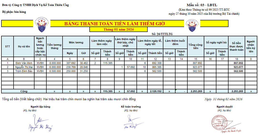 Các bạn muốn tải (download) Mẫu bảng thanh toán tiền lương bằng file Word hoặc trên file Excel theo Thông tư 99/2025/TT-BTC về để tham khảo và sử dụng thì có thể gửi mail về địa chỉ mail: ketoanthienung@gmail.com => Kế Toán Thiên Ưng sẽ gửi lại Mẫu bảng thanh toán tiền lương theo Thông tư 99/2025/TT-BTC bằng file Word hoặc file Excel này cho các bạn