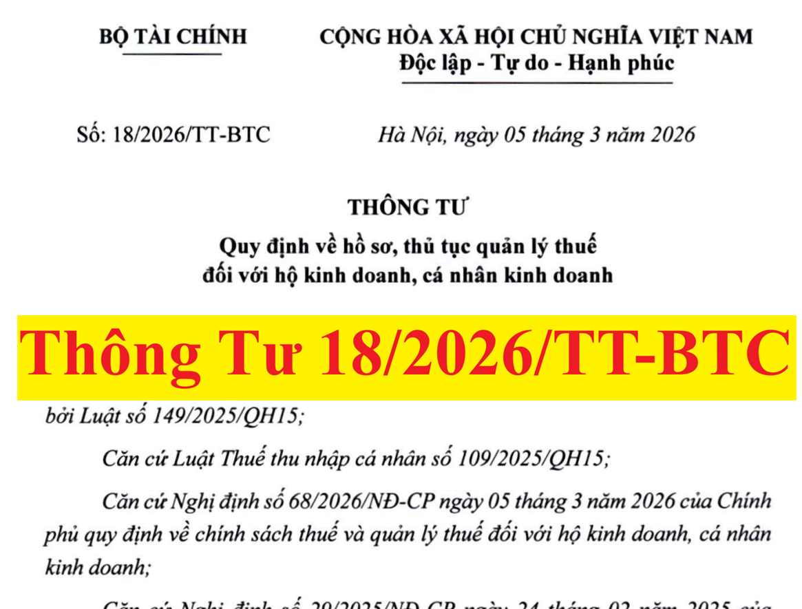 Theo quy định tại điểm d, khoản 1, điều 4 của Thông tư 18/2026/TT-BTC ngày 05/03/2026 quy định về hồ sơ, thủ tục quản lý thuế đối với hộ kinh doanh, cá nhân kinh doanh thì: