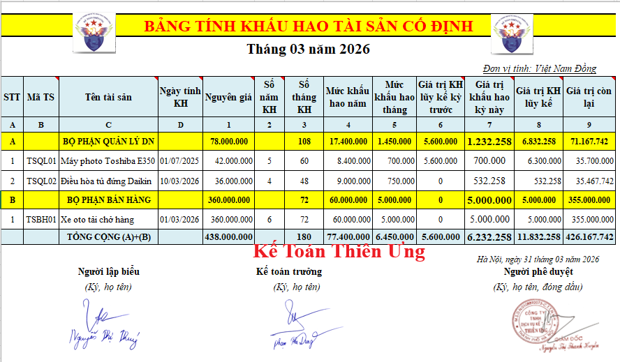 Mẫu bảng tính trích khấu hao tài sản cố định hàng ...
